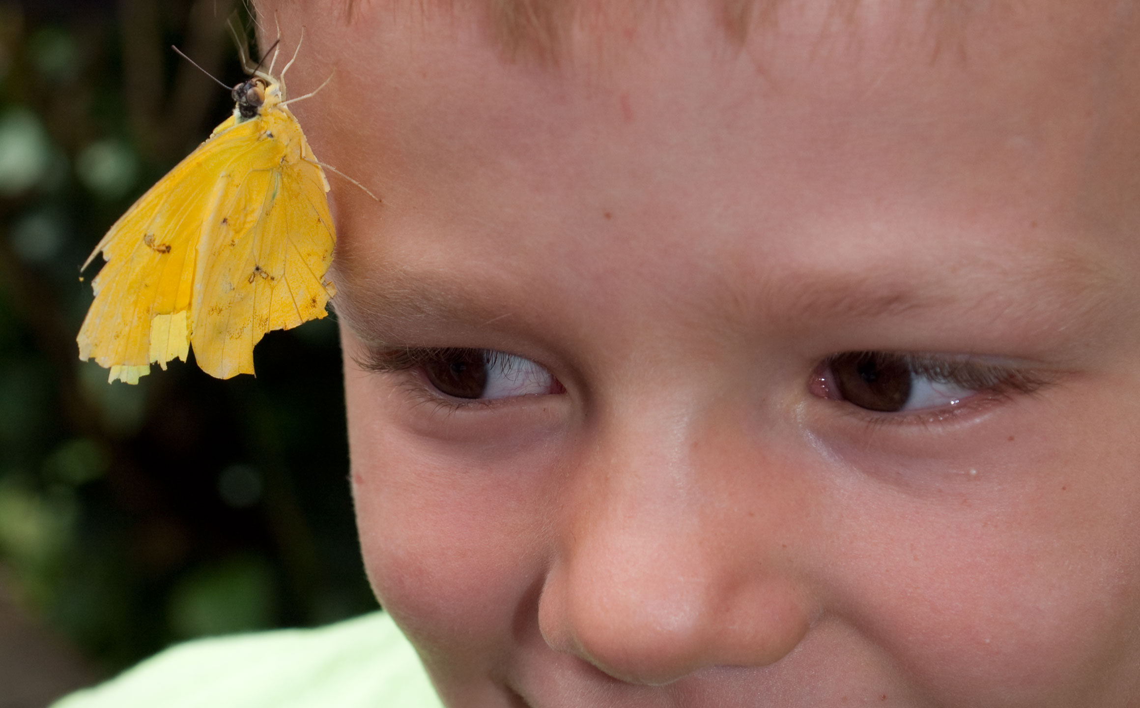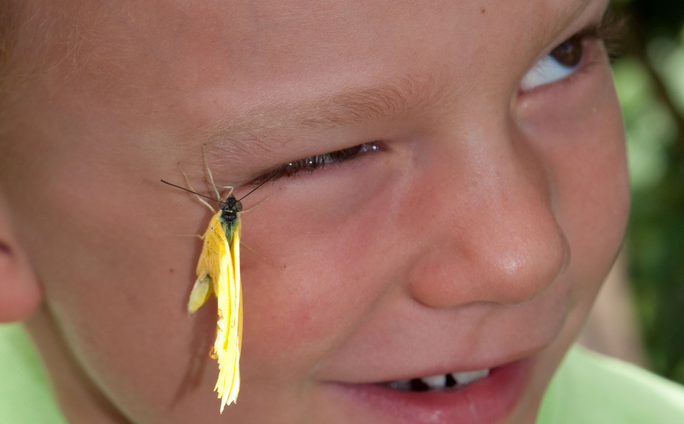 Then there are these of Sammy, who enjoys an almost magical relationship with animals. This specimen landed on his face and climbed from his chin to his forehead, taking a moment to stick an antenna in his eye (middle). As the other visitors watched in wonder, Dad went in for the tight shots. Again the E-30 satisfies!