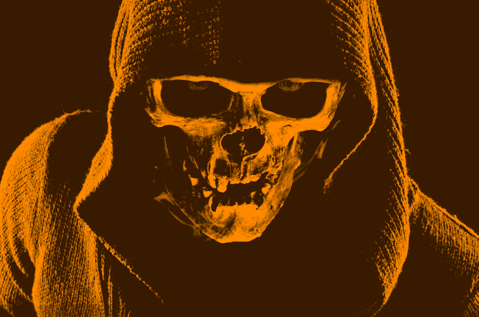 Next, Deke sets this dour demon on top of an orange fill layer and sets the blend mode so that the Halloween appropriate color scheme emerges as you can see up top.