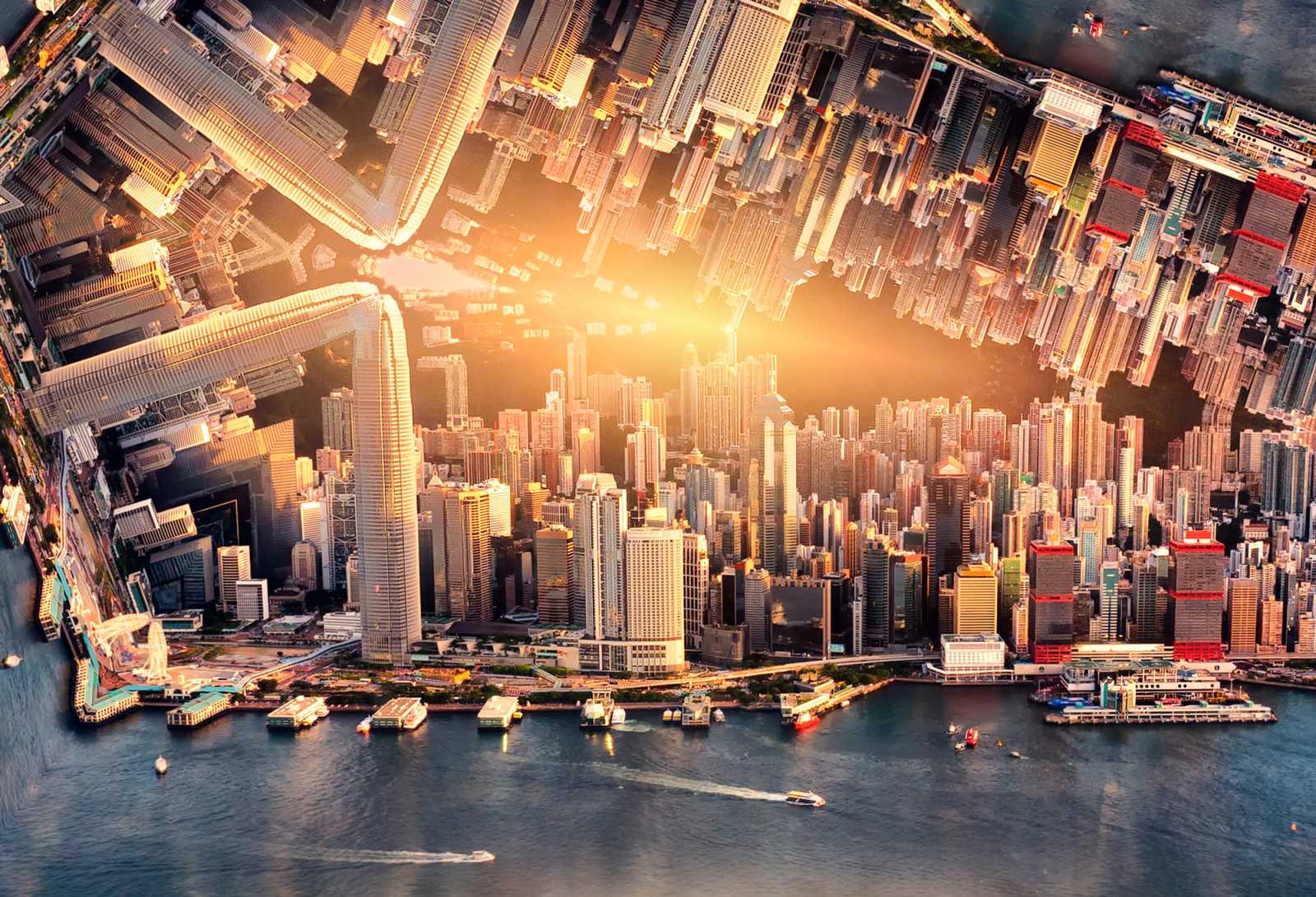 Using smart objects and vector masks, Deke is able to turn this photo of the Hong Kong skyline (courtesy of Dreamstime):