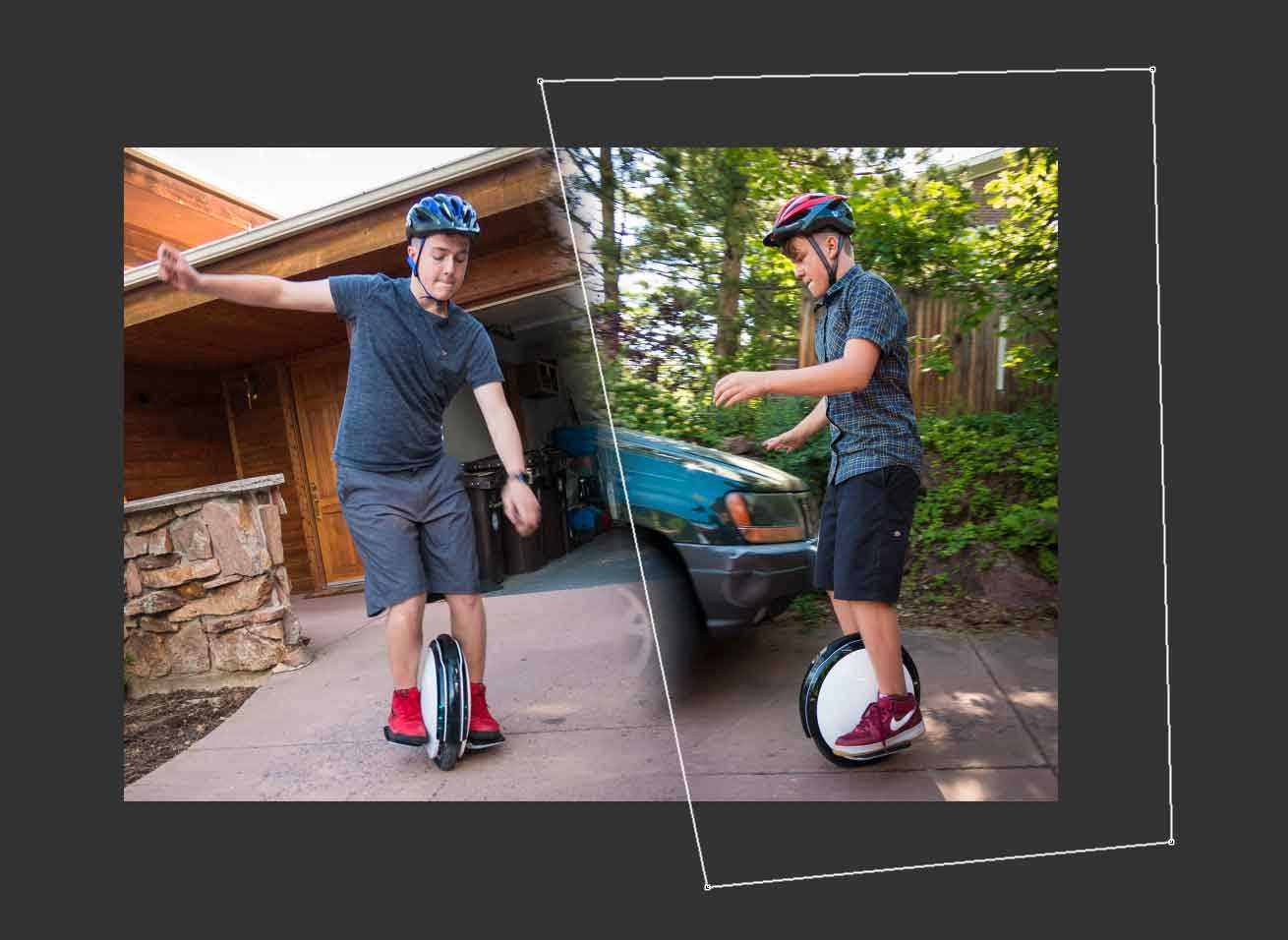 So, when both of your sons display the same amount of dogged determination, you don’t have to choose. You can draw a vector between images of each, and using vectors (that can be reconsidered at will depending on the flailing gestures of each son) create a split-screen effect that can be readjusted. Like so: