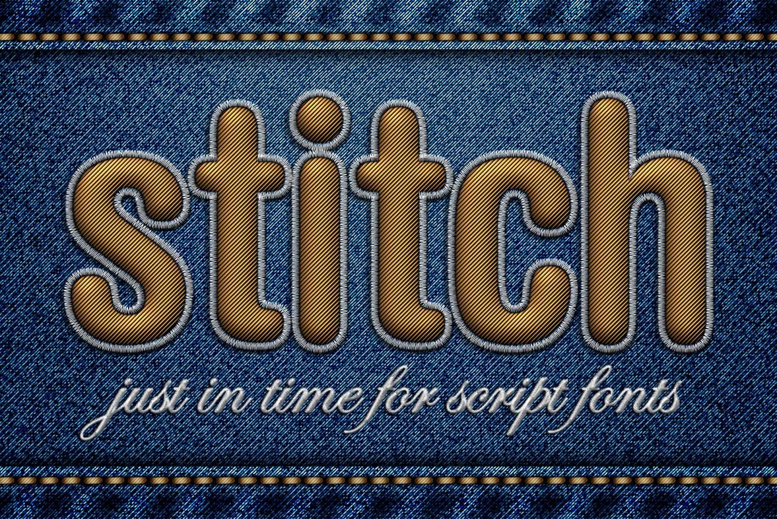 You start with a standard rounded font atop a nice piece of denim from the Dreamstime image library. Then by adding a series of layer effects, a diagonal pattern, and some stitch witchery with a custom brush, you turn this: