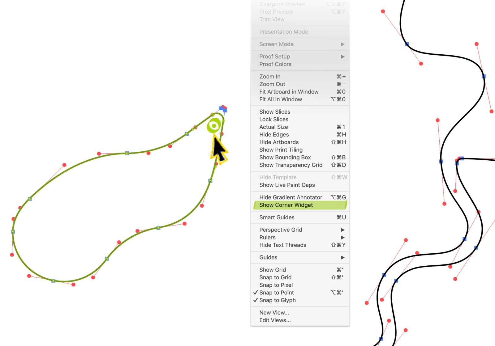 And then you can see just how easy and flexible it is to use the round corner feature in Illustrator. Grab the widget (ridiculously enhanced in the image above), drag, and voila, your corner is dynamically changed on the fly. Or on the triceratops.