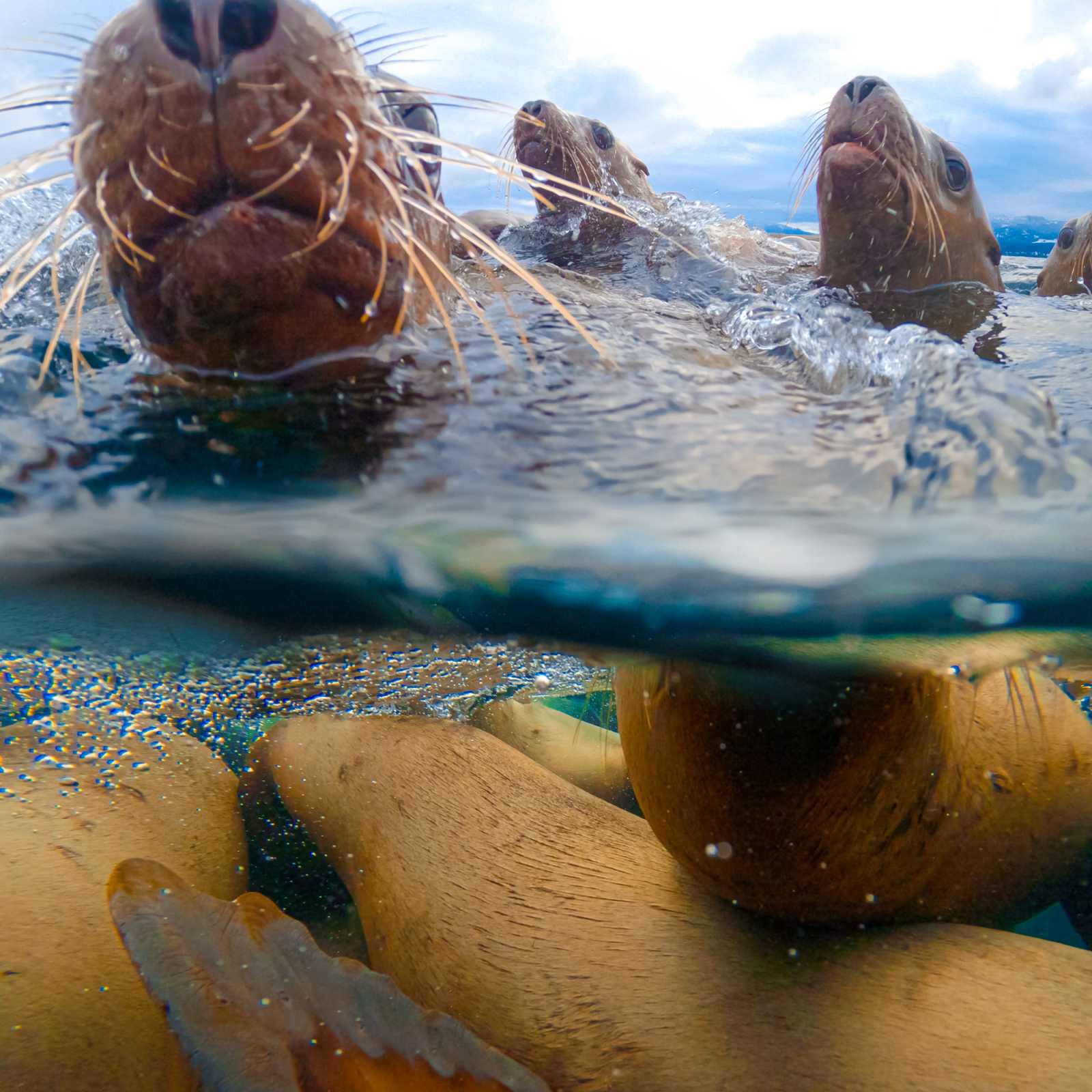 Meanwhile, a “real” over-under shot requires having the surface of the water hit the horizontal center of your lens, which in the case of a GoPro is smaller than most postage stamps and harder still to hit with several dozen Stellar sea lions jostling you about. Here’s the best “natural” version he got on our trip to Hornby.