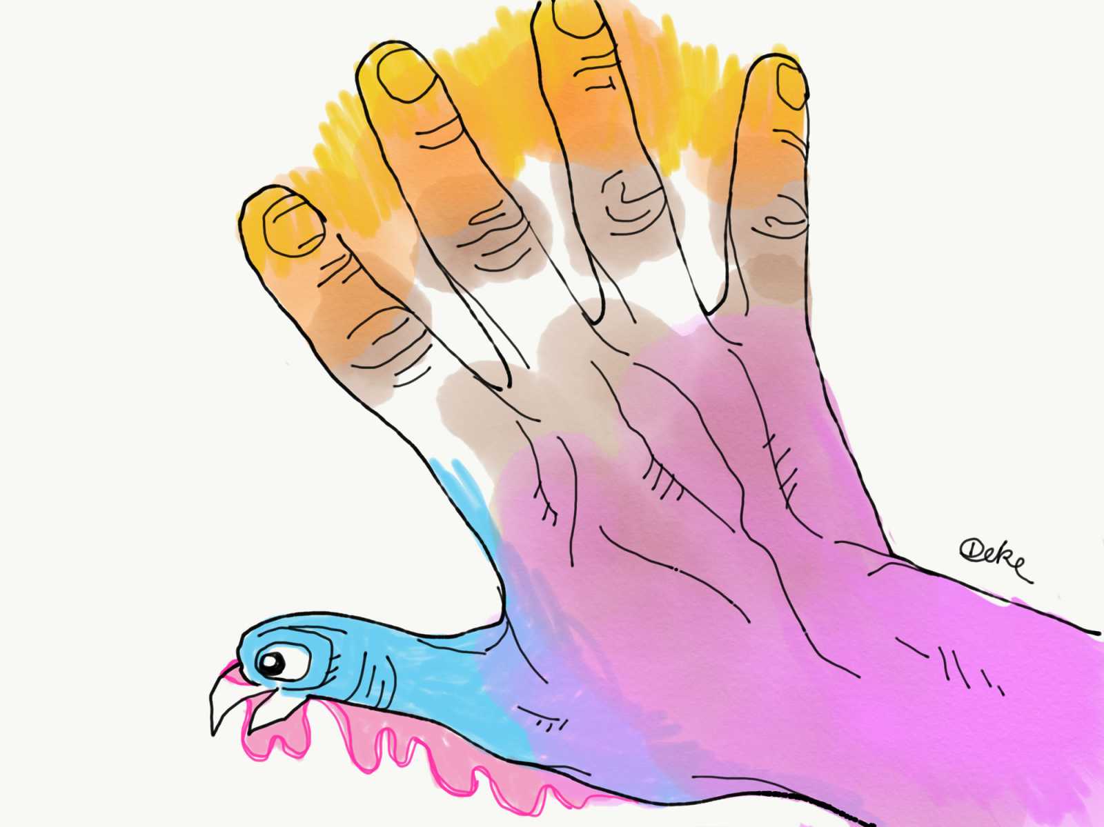 For those of you who haven’t been exposed to American kindergarten art projects or any one of the collection of hand turkeys we’ve created over the years here at the old dekeFarm, this so-called art form arises when you trace around your hand and then, well, turn it into a turkey.
