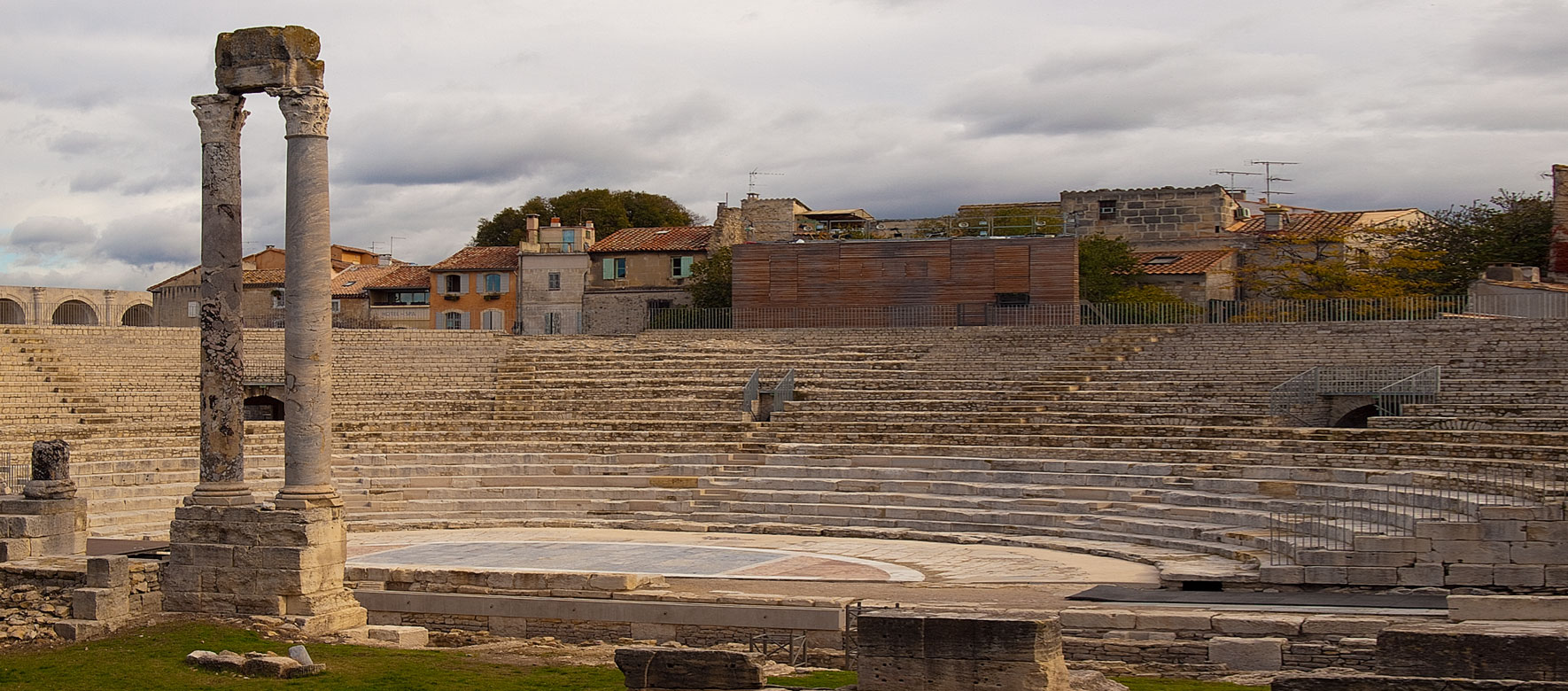 Our story takes up in Arles, where in 1888 either Gauguin or Van Gogh himself did the lacerating of the latter’s ear. But that wasn’t the only battle that took place in Arles. Back in Roman times, the town’s coliseum hosted a variety of blood sports, including gladiator matches and public dispositions of the criminal class. Alas, the only blood you’ll see there today is that of da bulls. As in Bull Fighting. Although I won’t speak to the morality of such “sport”—although I must say, one killing seems much the same as another to me, and any preference toward the sterile slaughter of steak cows strikes me as little more than bovine sexism—I like the idea that there’s at least a remote chance that the human Matador might take the fall. Meanwhile, here’s a stitched version of the inside of the Arles’ Coliseum, whose rocks have survived 2,000 years of wear.