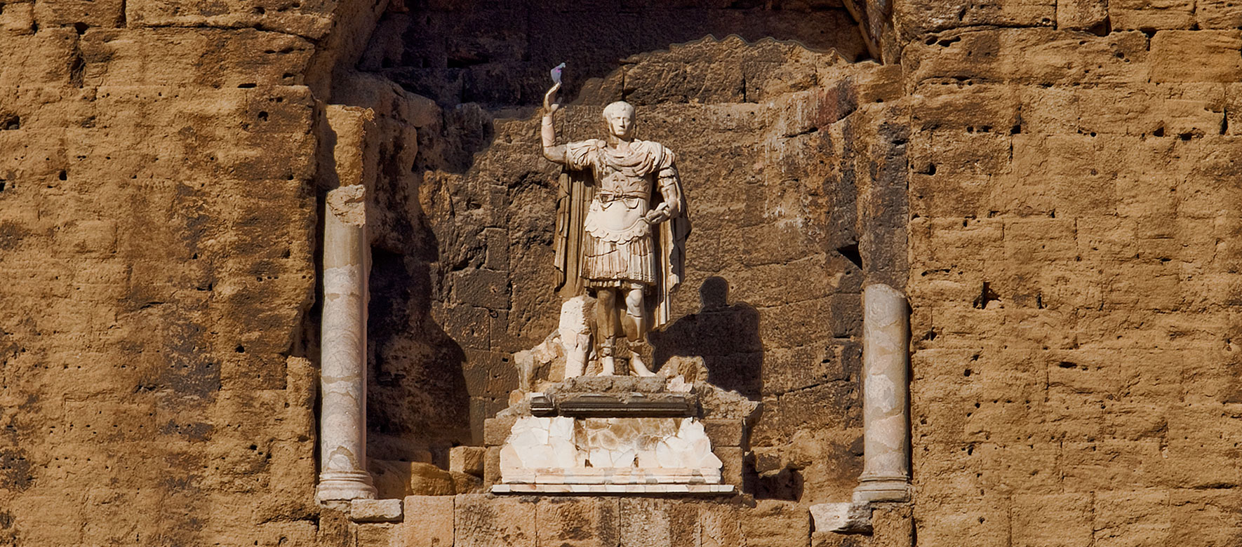 The next day, I and my companions drove north to the city of Orange (pronounced as two syllables, Oh and ranj). Below you see me, rendered as a speck, in the middle of the best-preserved Roman theater in the world, lacking only the original roof and a few mosaics. In recent years, this stage has seen the likes of Elvis Costello, Frank Zappa, and Robert Smith. But none of them compare with the early years of the Third Century, when actors rolled around entirely naked in mute pantomime. Upon learning this, I couldn’t help but wonder: Which of the aforementioned performers might have produced the most scintillating soundtrack?